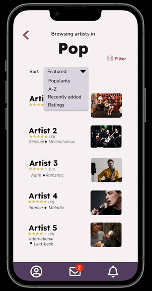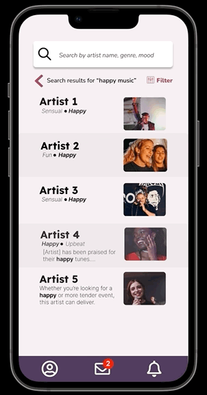 The UI of the search results was inspired by the UI of Netflix, colorfully describing the selection to quickly convey an artist’s general vibe.