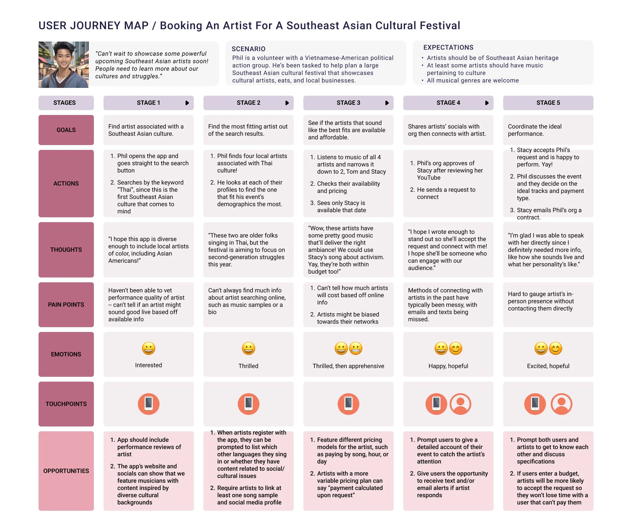 I used the information above to put together user personas and a journey map featuring common but diverse user journeys and needs, taking into account a wide range of events contrasting in theme and cultural background.